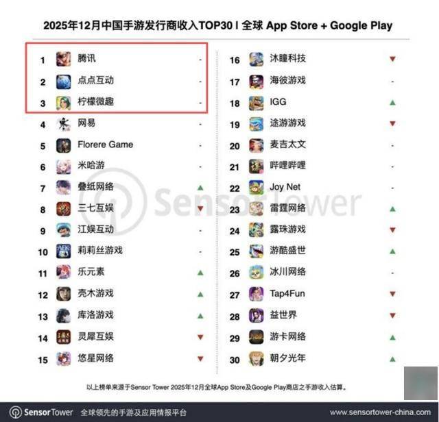 再来看Sensor Tower 的12月中国手游发行商收入榜(全球App Store+Google Play),前三的王座也不再是腾网米,而是变为腾讯、点点互动和柠檬微趣。腾讯盘子足够大自然不受影响,网易则是因为国内大量安卓端收入未被计入,米哈游的收入大头在PC端和国内安卓端,这部分也未被统计。